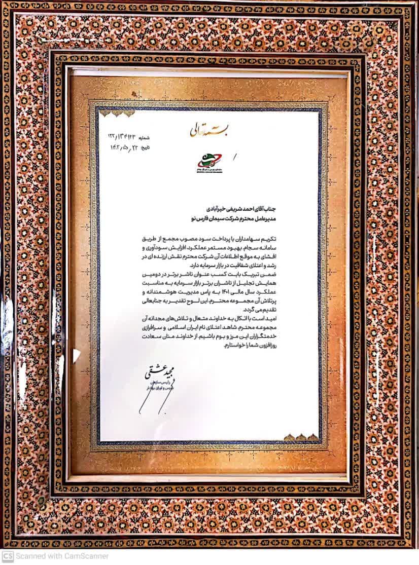 از شرکت سیمان فارس نو در برنامه تجلیل از 10 ناشر برتر بازار سرمایه ، به عنوان سومین ناشر برتر سال ١٤٠١بازار سرمایه و تنها نماد منتخب صنعت سیمان کشور تقدیر شد.