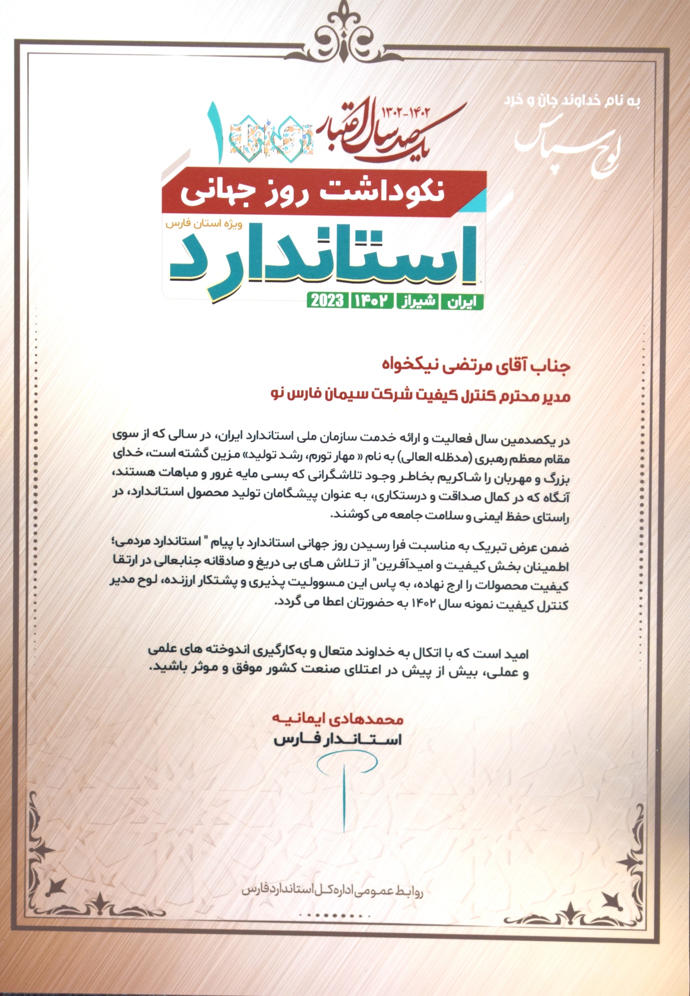 شایان ذکر است طی همایشی که با حضور استاندار محترم فارس ، مدیرکل اداره استاندارد استان فارس و دیگرمسؤلین استانی به مناسبت گرامیداشت روز جهانی استاندارد برگزار شد با اهدا لوح تقدیر از این مدیرنمونه شرکت سیمان فارس نو تجلیل شد.