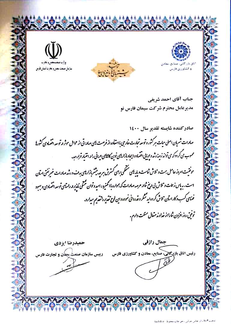 معرفي شركت سيمان فارس نو به عنوان صادر كننده شايسته تقديرسال 1400 در استان فارس